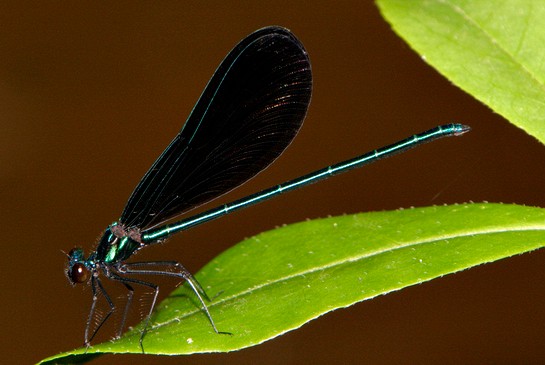 ) is the only other damselfly that may have completely dark wings. It lacks the blue-green iridescence on the body and the wings are only about a fifth as wide as long. In Sparkling Jewelwing (C. dimidiata
