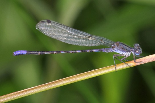 ith dark stripes running lengthwise. The inner sides of the tibiae are pale and the tarsi are black. There are generally only 3 postquadrangular cells in both the fore- and hindwing. The abdomen is pale violet or sometimes blue with black maculation. There is a basal black spot and small antero- and posterolateral spot on segment 1. Segment 2 has 3 spots, an apical and basal superior spot and an inferior middle spot; all of which may be confluent. Segments 3-6 are marked with black post-basally and on the apical 1/3 of each segment laterally. On segments 4-6 these post-basal streaks are generally confluent with the opposite side resulting in a distinct pale, dark, pale, dark pattern of the abdomen. Segment 7 is entirely black with a thin pale basal ring. Segments 8-10 are blue with a ventrolateral black streak. The cerci are divided at their tip and the cerci are sharply bifurcate with the lower lobe rounded and the superior lobe acutely directed dorso-posteriorly. The female is simila