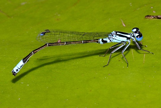 ) Bluet], though apparently without serious injury." Larvae cling to the bottom of the lily pads and emerge by crawling on top. The adults are nearly always encountered perching or ovipositing on these plants. They somtimes will exhibit a unique posture; while perching on a pad with the abdomen curled downward, they will tilt back on the abdomen with the front legs in the air ready for an immediate getaway. Females, unaccompanied by males, take up to 20 minutes to deposit eggs. One study on the color morphs in a north-central Texas population of this species found no evidence for dichromatic females, but rather that the color change was ontogenetic. Young teneral females are orange, but with the onset of reproductive maturity become blue. The authors of the study found females of netted copulating pairs were nearly always of an intermediate color form. The young orange color form, however, may be reproductively mature, as indicated by a photograph of a copulating pair in Westfall and