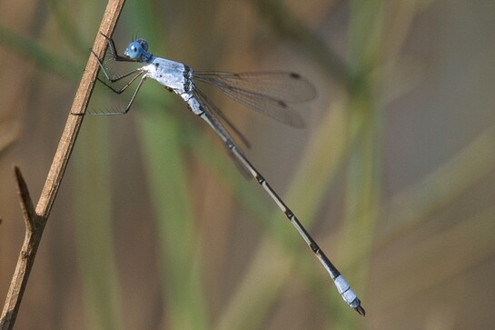 Older males of Rainpool Spreadwing (L. forficula ) are similar to Chalky Spreadwing, but the latter has distinctly sigmoid paraprocts and lacks a metallic green antehumeral stripe. Lyre-tipped Spreadwing (L. unguiculatus ) males also have sigmoid paraprocts, but are smaller in size and more northerly distributed. Lyre-tipped Spreadwing also lack dark marks posterior to the legs on the underside of the thorax.