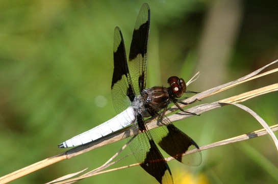 This is one of the most familiar dragonflies to the casual observer as well as one of the most studied. It has been collected in every county in Arkansas (Harp pers. comm.). The distinct white abdomen of mature males is used in displays to threaten other males. They elevate the abdomen above the rest of the body and fly towards an intruder. Males patrol moderate-sized habitats of 15-30 m around the shores of ponds, lakes and occasionally streams. They will often venture some distance from their breeding sites and may commonly be seen along roadsides and path margins perching on the ground, logs or low vegetation. Adults mature after an average of two weeks, after which they return to bodies of water to breed. Males are aggressive, often stealing females from other males. Mating is quick, occurring as the pair hovers over the water, usually no