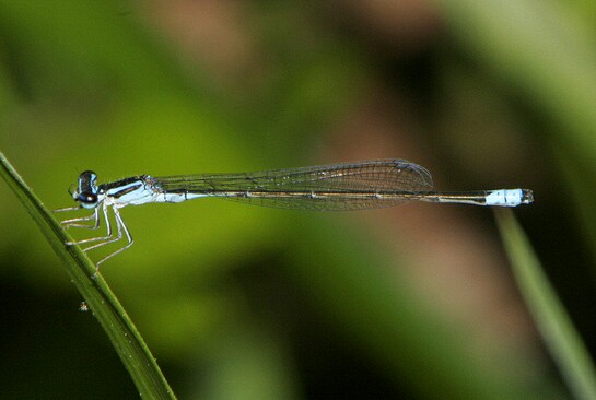 ) has blue dorsally on abdominal segment 7. Dorsally, abdominal segment 8 in Stream Bluet (E. exsulans