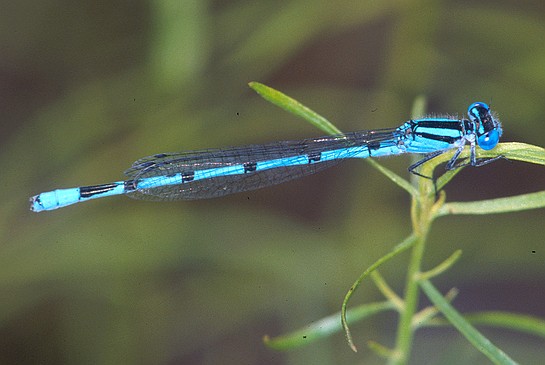 en overlooked because of its similarly to Familiar Bluet. Atlantic Bluet shows some tolerance to saline waters along the coast, but is most typically found in sandy-bottomed new or ephemeral ponds. Males can generally be seen conspicuously perched on riparian vegetation at the water's edge. Pairs mate on emergent vegetation and females lay eggs in tandem. The female will remain underwater, laying eggs after pulling free from the male, for only a few minutes at a time. Males remain perched nearby, guarding the female. Leafhoppers are a common prey of Atlantic Bluet.