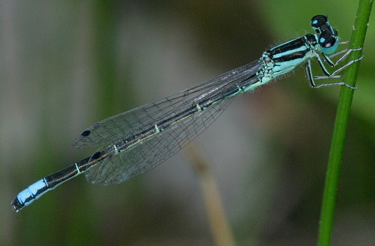 ) but the dark ventrolateral stripe on segment 9 in that species is often reduced to less than half the length of the segment and in Western Forktail it is generally greater than 1/2. The postocularspots are much larger in Lilypad Forktail (I. kellicotti). Eastern Forktail (I. verticalis