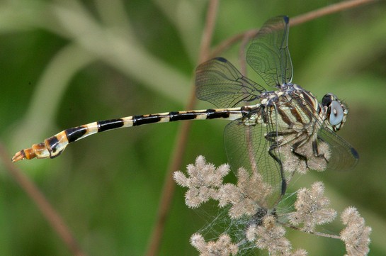 ) except the lateral thoracic stripes are narrower. The third lateral stripe ends ventrally and is never confluent with the midlateral stripe. The wings and abdomen similar to Five-striped Leaftail except in females, which have a nearly cylindrical abdomen, with only a weak expansion of the posterior segments laterally.