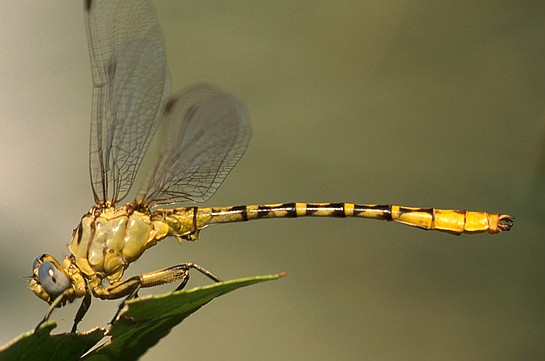 This is the only western hanging clubtail in the region. The face is pale yellow-green with little dark maculation on the head. The thorax is pale green with a dark brown middorsal stripe interrupted medially by a pale carina. The narrow antehumeral stripe becomes exceedingly pale at its lower end. The remaining lateral str ipes are obsolete or nearly so. The femora are yellow except distally where they become darker running into black tibiae and tarsi. The abdomen is yellow-green with brown triangular lateral spots confluent dorsally. The caudal appendages are yellow edged with black in the male.