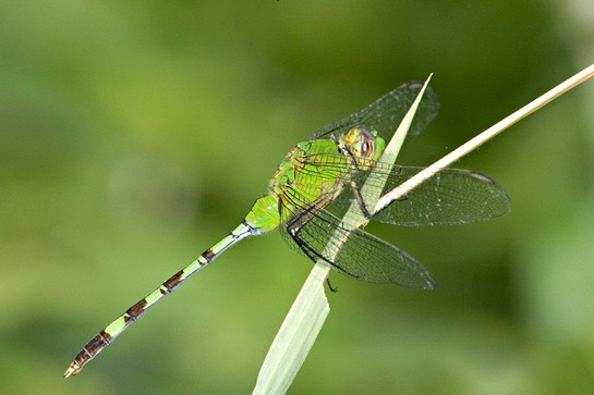 ) Pondhawk species which have interrupted rings or spots on abdominal segments 4-7. Similar looking clubtails will all have the eyes separated on top of head.