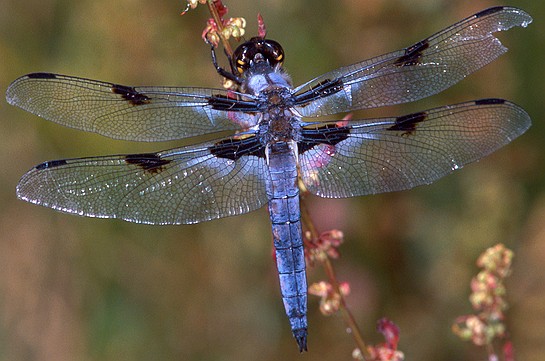 Bleached Skimmer (L. composita ) has a white face, amber basal wing spots and lacks thoracic spots. Eight-spotted Skimmer (L. forensis ) has a broad crossband of brown at the wing nodus. Four-spotted Skimmer (L. quadrimaculata ) lacks the basal brown stripe in the forewing.