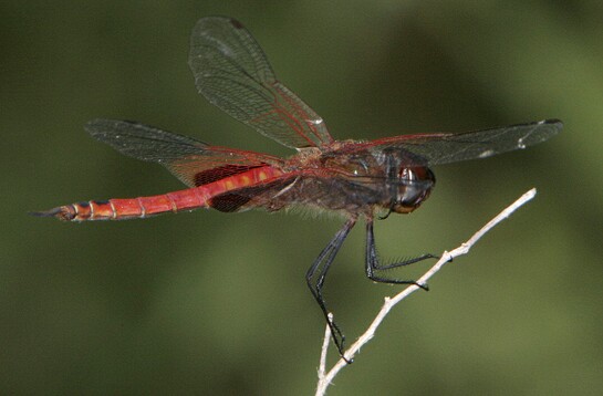 This species is predominantly found in the Bahamas and Greater Antiles but is fairly common in southeastern Florida and ranges into Mexico and Texas. The face is brown in females and young males but becomes black in mature males. The top of the head is metallic violet. The thorax is brown and unmarked. The wings have predominantly red veins anteriorly and the hindwings each have a brown basal crossband. The legs are black except at their extreme bases. The abdome n is red, except segments 8, 9 and sometimes 10, which are black dorsally.