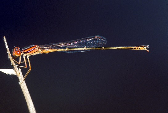 This species is closely related to Orange Bluet, but little is known of its reproductive behavior and ecology. It is usually seen on emergent vegetation and lily pads, where females curl their abdomens to oviposit on the underside of the latter's leaves. It is relatively uncommon in our area, limited to the extreme southeatern parts of the region.