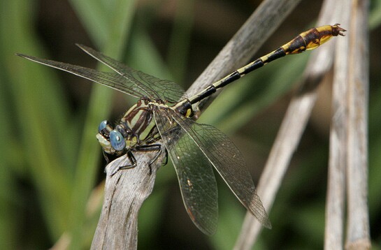 This is the most widespread common clubtail (Gomphus ) in the region, although it is conspicuously absent in both Arkansas and Louisiana. It is marked with the most yellow and is the brightest colored of the common clubtail species. The face is yellow with no evidence of dark stripes. Females have a pair of minute spines present on the vertex. The front of the thorax is distinctly more yellow than the darker sides. The brown middorsal thoracic stripe is narrow, but widens slightly toward the collar. The antehumeral stripe is well separated from the humeral stripe and it is free at its upper end. The pale stripe between them is 1/2-2/3 their width at its widest. The humeral stripe narrows at its lower end. The midlateral stripe is thin and always present, but generally interrupted above the spiracle. The third lateral stripe is also thin, but well-developed. The legs have more yellow than other species. The predominately black femora and tibiae both have yellow stripes on their outer surfaces. The black abdomen is conspicuously narrowed medially. There is a wide, pale yellow middorsal stripe that is nearly continuous on the middle segments. Segments 7-9 are expanded laterally, less so in females, and segments 8-10 are diffusely yellow with brownish-yellow caudal appendages. Dorsal and lateral pale yellow areas on segment 9 are narrowly separated. Males are distinctive because of the enlarged, distinctly warty peduncle.