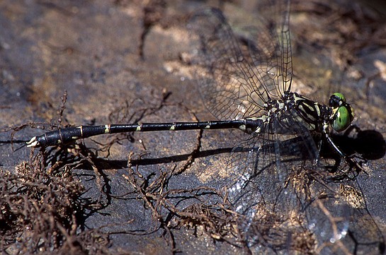 This species is the smallest clubtail in the region and is found in forest streams in eastern Oklahoma and western Arkansas. The body is dark green with distinct black cross stripes on the face. The thorax is green with the front appearing black except for a thin pale middorsal carinae, two lateral pale stripes and the anterior collar. The humeral and midlateral stripes are all dark and well-developed. The third lateral stripe is usually present, but may be lacking in some individuals. The wings are clear with a dark brown pterostigma and sometimes a hint of flavescence basally. The abdomen is black, with a narrow pale yellowish-green basal rings. The caudal appendages are pale distally.