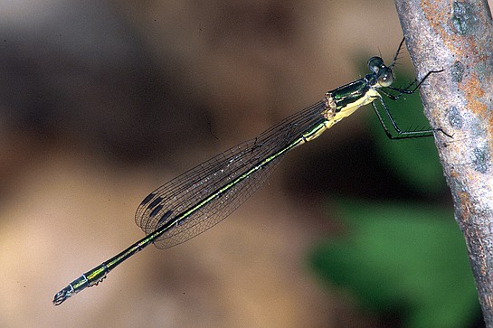 ) which has rusty-brown antehumeral stripes and the back of its head is black. Emerald Spreadwing (L. dryas