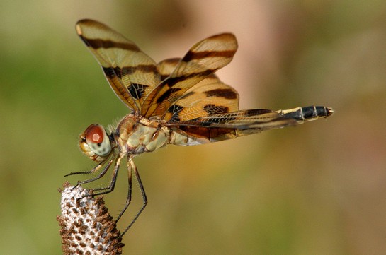 This is the largest, most widely distributed, and perhaps most colorful small pennant species in the region. Its common name is descriptive because of its distinctive orange and brown or black wings. The face is yellowish or olivaceous, becoming darker with age and red in males. The thorax is yellowish-green with a dark middorsal stri pe and narrow lateral stripes on the sutures. The midlateral stripe is usually not continuous after the spiracle. This is the only species with completely yellowish-orange wings marked with broad dark brown or black stripes and a red pterostigma. The abdomen is slender with pale yellow dorsal spots on segments 3-7 that become red with age.