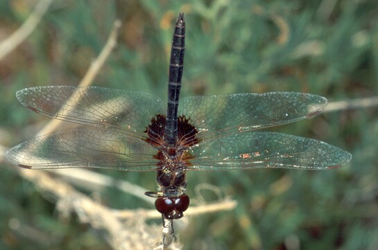 ) all smaller with a lighter stripe through the dark basal patch in each hindwing. Spot-winged Glider (Pantala hymenaea
