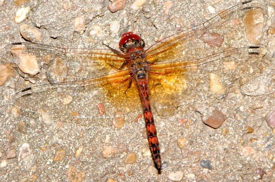 This is a moderate-sized dragonfly found throughout the southwestern parts of the region. Young males and females have a pale face, but it becomes bright red along with the vertex in older males. The thorax and abdomen are brownish-gray heavily marked with black. The front of the thorax has a dark rectangle anteriorly. There are two large dark spots, one in front and one below the humeral suture, that are visible from the side. The mid- and third lateral sutures, along with rear margin of the pterothorax are each marked with a heavy, but irregular, black stripe. The wings each have a broad area of flavescence basally that is more pronounced in males and a darker stripe on either side of the midbasal space. The legs are pale externally and dark on the inside. The abdomen is marked with black on the carinae and irregularly so on the rest of each segment. The front of the thorax and the en tire abdomen in mature males is red.