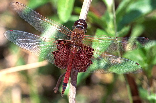 This is a large handsome red species found predominantly throughout the eastern portion of the region. Its face is initially pale but becomes red and the top of the head, including the vertex, turns metallic violet in older individuals. The thorax is reddish-brown and unmarked. The wings have red veins along the front margin. The hindwing has a nearly solid dark reddish-brown band that extends out to the outer side of the anal loop. The veins in this area are red. The legs are brown basally and turn darker for most of the rest of their length. The abdomen is brownish-red, becoming bright red in mature males. Segments 8 and 9 are largely black.