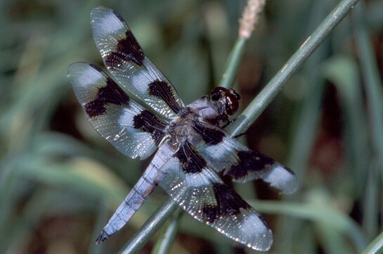 ) Whitetails have shorter abdomens and a brown band in the wing that reaches from the nodus to the pterostigma.