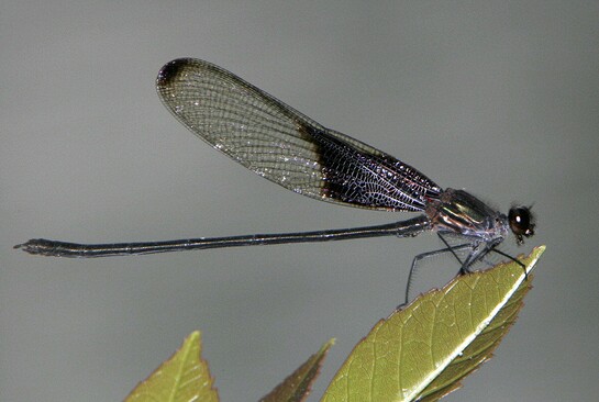 ) revealed occasional intergrades between the two female color patterns of the thorax and showed no apparent difference in flight season leading Johnson and Westfall (1970) to place these forms in a species complex. I follow Garrison (1990) who considers them forms of one species, based on the lack of detectable morphological differences between sexes of either form. The differences in degree of wing color in this species may be correlated with seasonality. Spring populations tend to have the dark markings in their wings restricted to the basal 1/4 of the wing, while mid-summer pouplations show a considerasble increase in the degree of brown in the wings and fall generations have completely dark wings. Like American Rubyspot, both sexes of Smoky Rubyspot perch horizontally on vegetation along the shore. They tend to prefer perches higher up and are more wary than the former. Females will invite mating by hovering and reject males with a display similar to that seen in Ebony Jewelwing (Calopteryx maculata), involving a simultaneous spreading of the wings and bending of the abdomen upward. Guarded above by males, females will spend up to two hours ovipositing underwater in wet wood.
