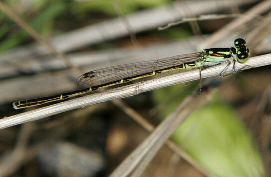 The antehumeral stripe in Plains (I. damula ) and Western (I. perparva ) Forktails is divided into subequal anterior and posterior spots and abdominal segments 8 and 9 of males are blue. Citrine Forktail (I. hastata ) females are similar, but generally paler in color, have a complete (though often obscured ) antehumeral stripe and may have a vulvar spine on segment 8.