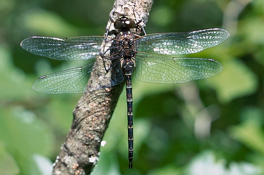 This small dark darner has green eyes in life and the costal margin of the wings are yellow. The first and third or fourth antenodal crossveins are usually thickened and there is a single bridge crossvein. The middle half of the female forewing is generally tinte