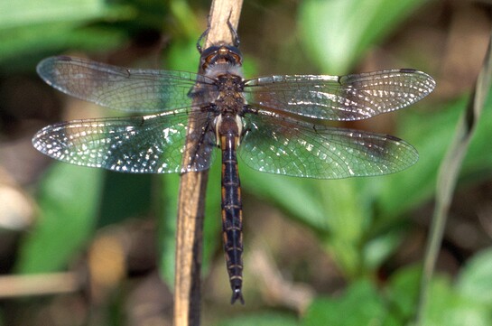 ) is sometimes considered a form of Stripe-winged Baskettail. There are slight differences in the cerci of these two species, but some Dot-winged Baskettails have clear wings and this character alone cannot reliably distinguish between the two species. Sundragons (Helocordulia