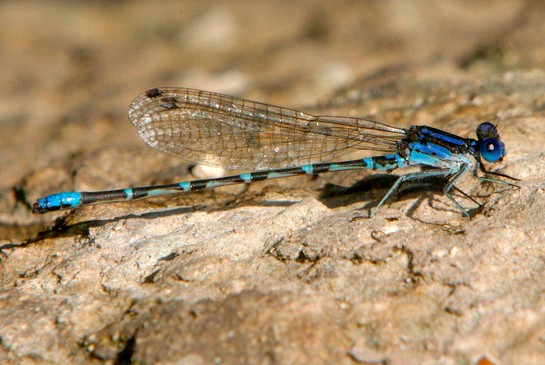 This species is more prone to perching on vegetation, often in the shade, than most dancers. Pairs require 10-15 minutes to mate and egg laying occurs in tandem, often in large numbers. A mark-recapture study on adult Blue-ringed Dancers at a small creek on the campus of the University of Texas at Arlington revealed that males had an average daily probability of survivorship of 0.79 and that activity was closely correlated with bright sun.
