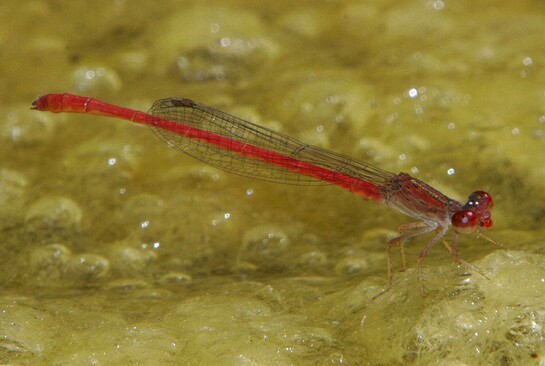 Males and females are essential identical in coloration to Duckweed Firetail (T. byersi). The male cerci are slightly longer than in Duckweed Firetail, reaching 2/3-3/4 the length of segment 10. The dorsal surface of each appendage is straight for a quarter of its length, when viewed laterally, then abruptly turns downward. Each appendage bears two separate, subapical, medial black teeth. The paraprocts are half again as long as the cerci and slightly more upturned than in Duckweed Firetail. The mesostigmal plates of the female are subtriangular with little sculpturing, closely resembling the Duckweed Firetail.