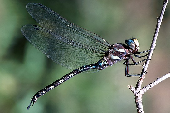 Where Riffle Darner is found it can be rather common. The male's eyes are blue. The thorax is brown with two lateral thoracic stripes that are blue above fading to yellow below. The anterior lateral thoracic stripe is narrowed at its upper 1/3 to form two separated stripes. The abdomen in the male has small blue spots on the anterior segments and yellow spots on the posterior s