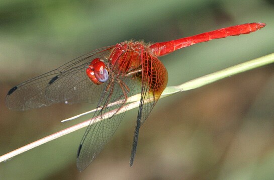 ) is profusely marked with black on the thorax and abdomen and perches on rocks and on the ground. Neon (Libellula croceipennis