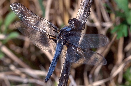 This is one of the few skimmers that may be commonly seen perching on the ground with the wings depressed. They will also perch vertically on trees exposed to sunlight in the late afternoon, probably using the depressed abdomen as a heat collector. This and other behaviors make it similar to Whitetails (Plathemis ) in habit. It emerges in the early spring for a relatively short time. Males patrol the edges of ponds and lakes, sometimes resting on floating debris or low on vegetation. They have a low fluttering flight occasionally interrupted by hovering. Mating occurs on the wing and females lay eggs immediately after while guarded by the male. They lay eggs by short dips of the abdomen to the water. Females are not often encountered near the water except to mate or lay eggs. This species is unusual among most skimmers in the south in that it overwinters as a final instar larva.