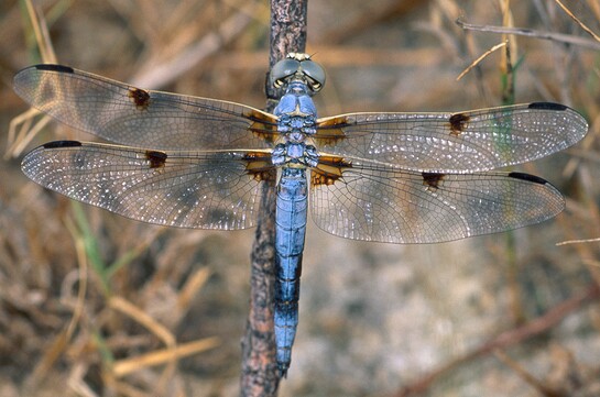 ) is smaller, lacks wing spot at the nodus and does not have whitish pruinosity. Segments 1-6 of Four-spotted Skimmer (L. quadrimaculata