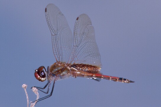 This tropical species has expanded its northern range into Texas. It has a pale yellow face that turns red in mature males and the vertex is metallic violet. The thorax is brown with 2 oblique pale stripes laterally. The wings are clear with a broad basal brown stripe in the hindwing. The legs are pale basally and darker beyond. The abdomen is yellowish in females and red in mature males. Segments 8-10 are black dorsally.